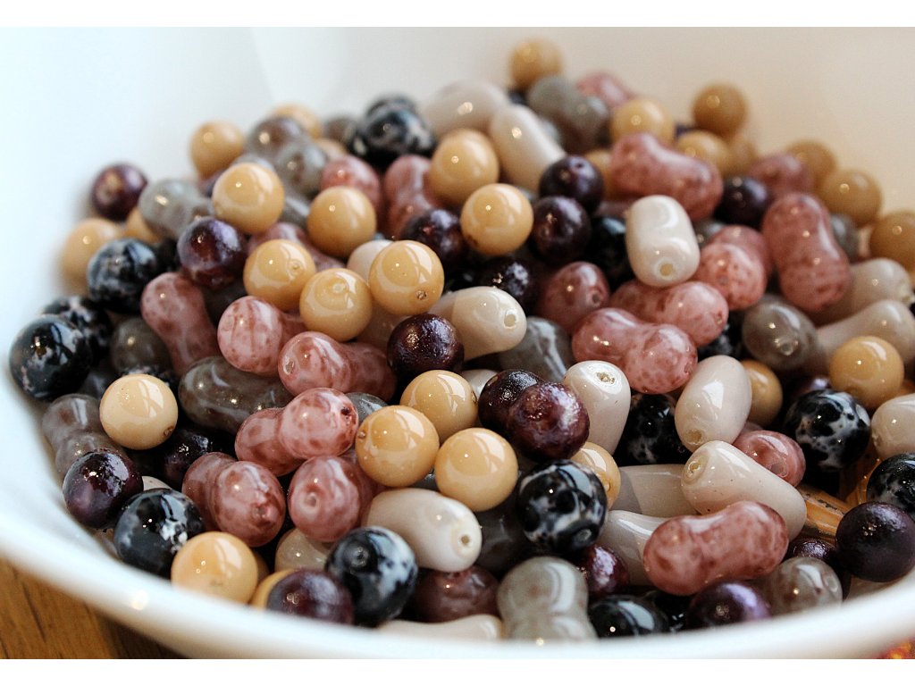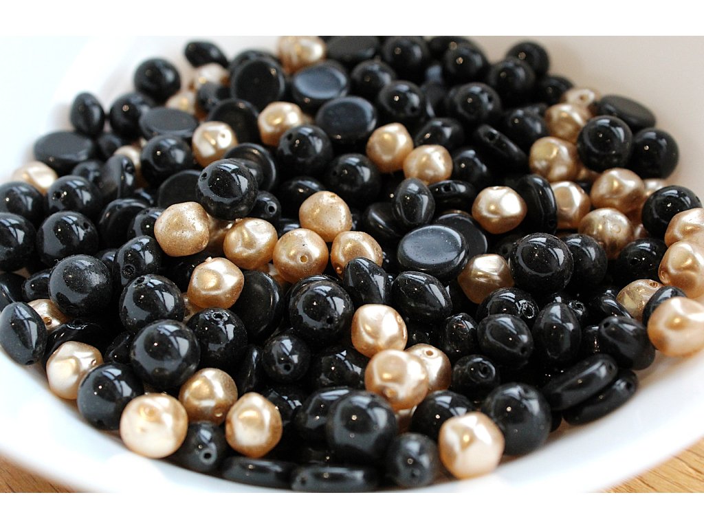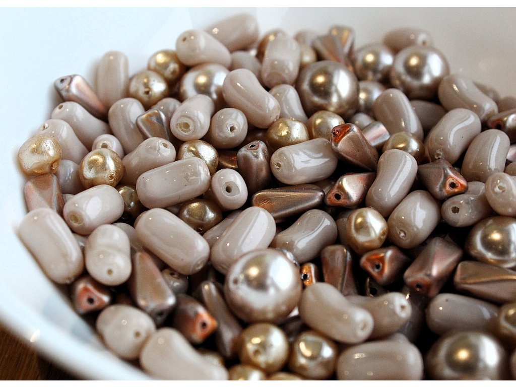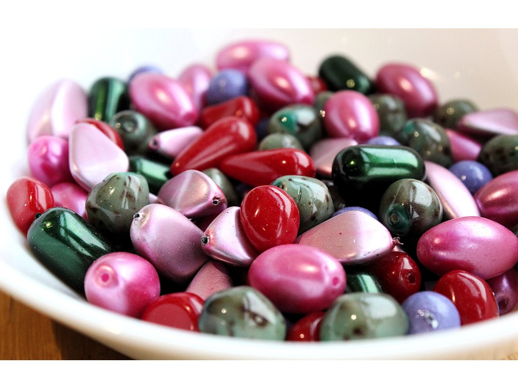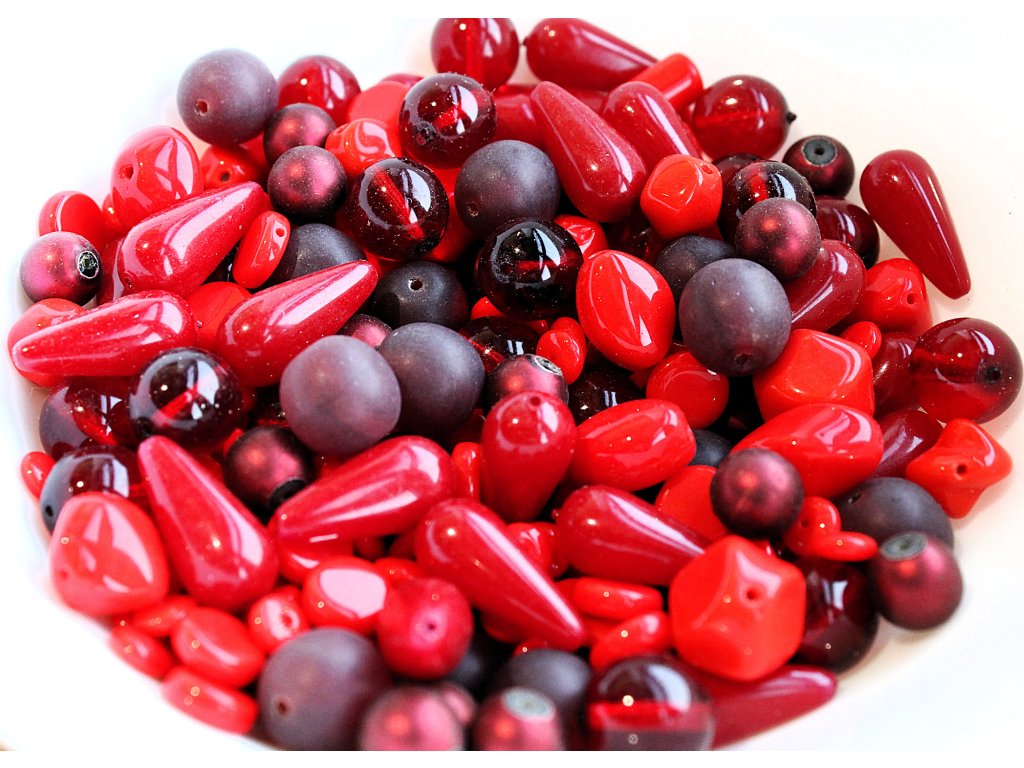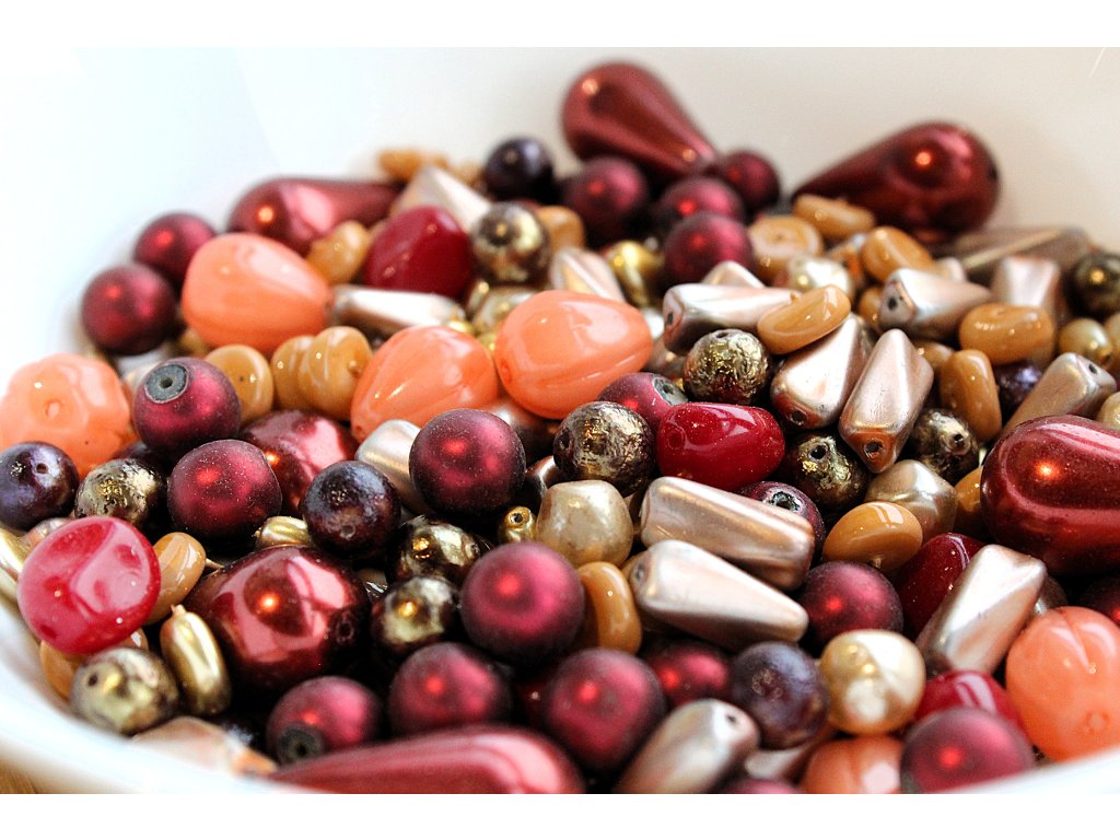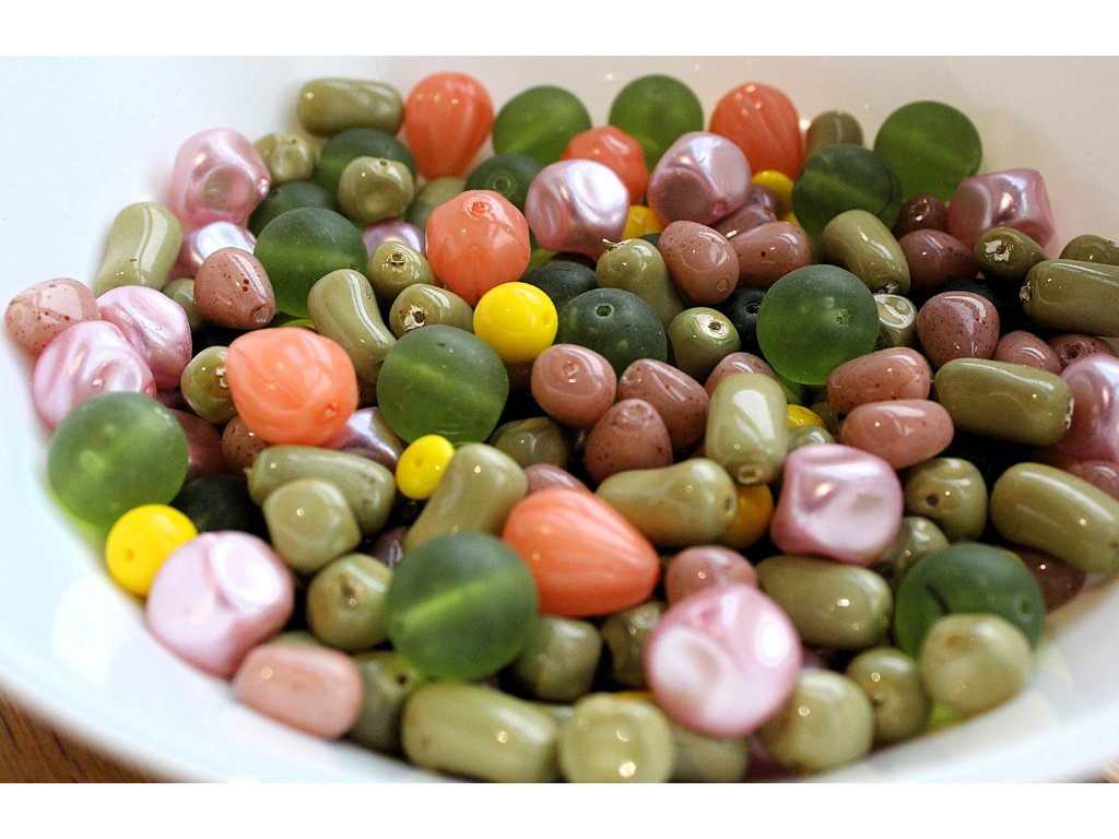 - mix skleněných perlí výhradně kuliček (dekor 95 % vosk, 5 % jiný dekor) různých velikostí a barev.